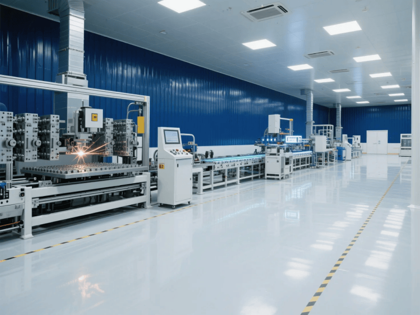 智能控制系統(tǒng)集成環(huán)境監(jiān)測(cè)、設(shè)備聯(lián)動(dòng)和MES數(shù)據(jù)看板,深藍(lán)墻面上嵌裝LED智能顯示屏,實(shí)時(shí)反饋生產(chǎn)數(shù)據(jù)。激光焊接區(qū)配備黃光防眩照明,工作站外圍設(shè)置淺灰環(huán)氧樹(shù)脂警示帶。整體設(shè)計(jì)通過(guò)冷色調(diào)的科技美學(xué)與自動(dòng)化產(chǎn)線的有機(jī)結(jié)合,構(gòu)建高效可靠的光伏材料智能制造空間。
