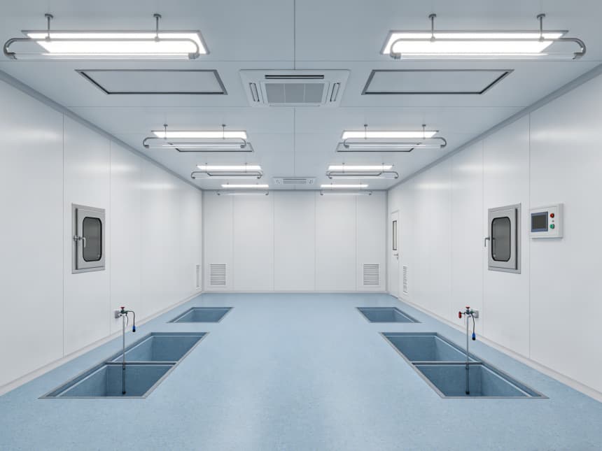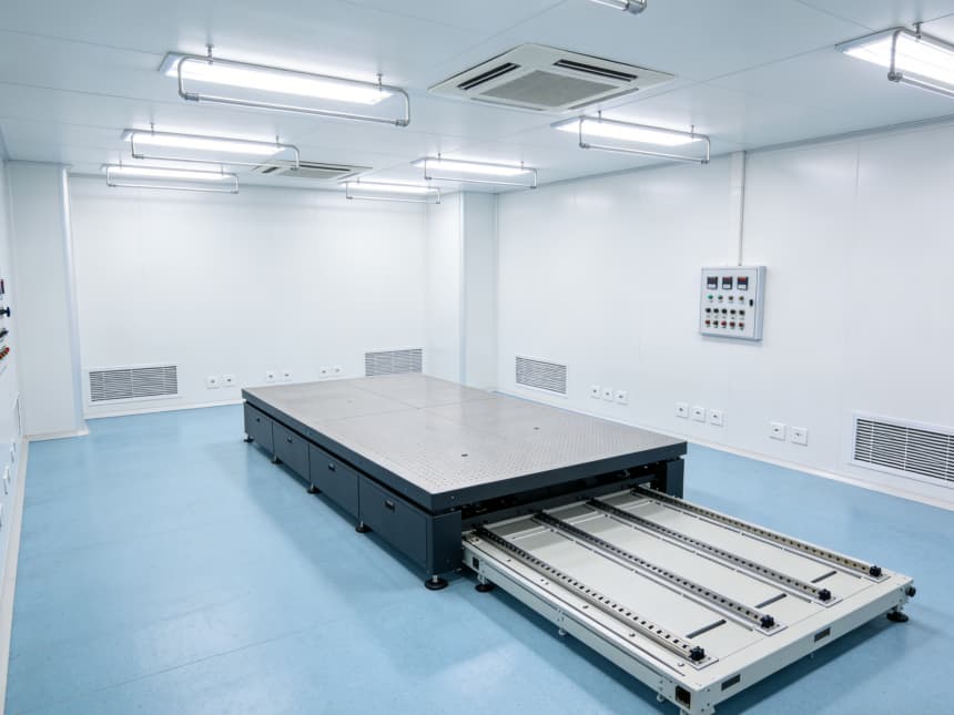 電子光學(xué)車間內(nèi)部細(xì)節(jié)設(shè)計精準(zhǔn)匹配行業(yè)核心需求,整體采用淺藍(lán)色防靜電潔凈地坪與白色無縫潔凈墻面的組合,風(fēng)格簡約統(tǒng)一。地面選用3mm厚環(huán)氧防靜電材質(zhì),表面經(jīng)啞光工藝處理,既能有效規(guī)避強(qiáng)光反射對光學(xué)檢測造成的干擾,又具備10?-10?Ω的穩(wěn)定防靜電性能;同時兼具優(yōu)異的耐磨特性,可耐受酒精等常用清潔劑擦拭,墻角均采用50mm圓弧設(shè)計,從根源上消除積塵死角,筑牢潔凈基礎(chǔ)。