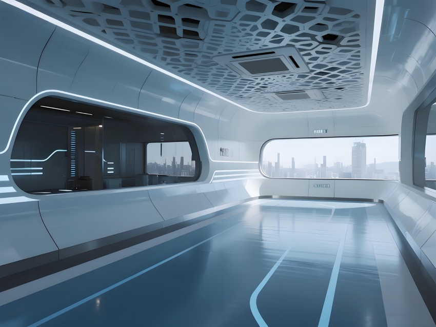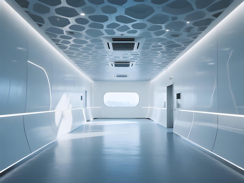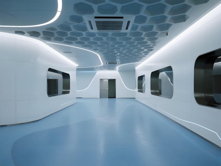 本車間空間以冰川藍與鈦白為主色調,弧形墻角與無縫地坪構成流暢的潔凈界面,頂部蜂窩狀FFU陣列形成科技感天花肌理。灌裝區(qū)透明亞克力防護罩展示自動化生產線運作,配合層流工作臺的紅色氣流可視化設計,強化無菌核心概念。功能模塊通過地面灰色導視帶串聯(lián),設備區(qū)的鏡面不銹鋼與控制面板的藍色背光形成冷調光效。玻璃觀察窗嵌入電子壓差計,走廊的漸變光環(huán)境引導系統(tǒng)在滿足GMP動態(tài)監(jiān)測要求的同時,營造出未來實驗室般的專業(yè)氛圍,緩解員工長時間密閉作業(yè)的疲勞感。