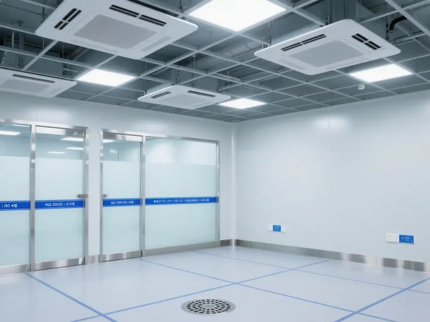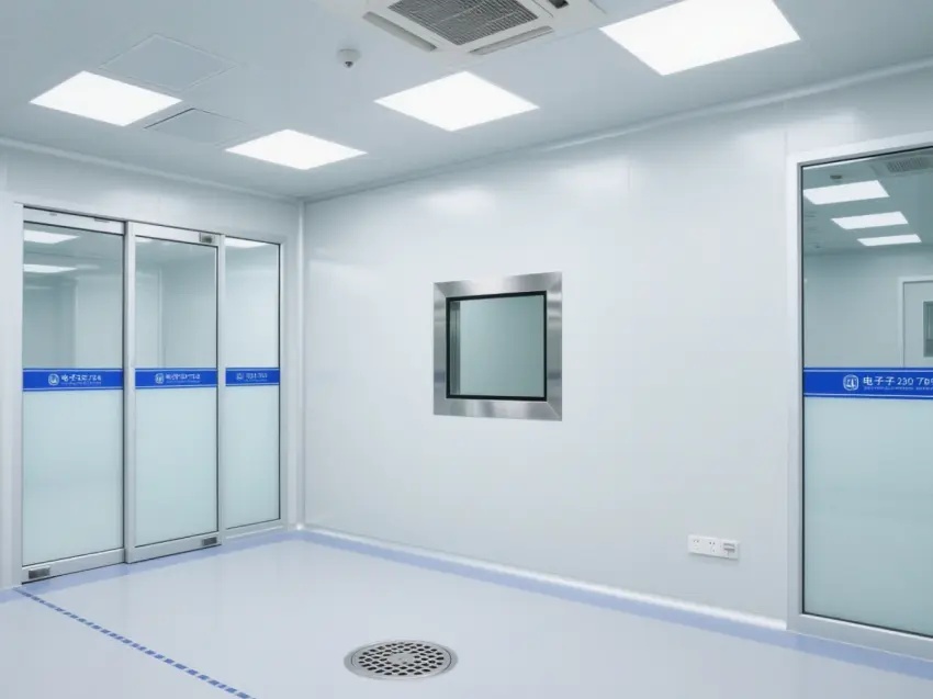 車間的天花板上安裝了多個方形的照明燈,提供充足的光線,同時還有通風設備,確保空氣流通,保持車間內的空氣潔凈度達到萬級標準。墻壁上有一些玻璃窗戶和門,便于觀察內部情況。