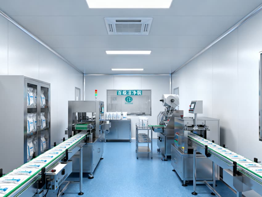 凈化配套設計全面:藍色地面具備抗菌、易消殺特性,配合地面導坡設計加速清潔排水,減少污漬殘留;白色墻面采用無縫抗菌涂層,消除清潔死角,降低微生物附著風險;全車間劃分獨立凈化分區(qū),通過壓差控制預留設計隔絕不同潔凈等級區(qū)域,人流、物流通道分離避免交叉污染,全方位保障無菌生產(chǎn)環(huán)境穩(wěn)定達標。