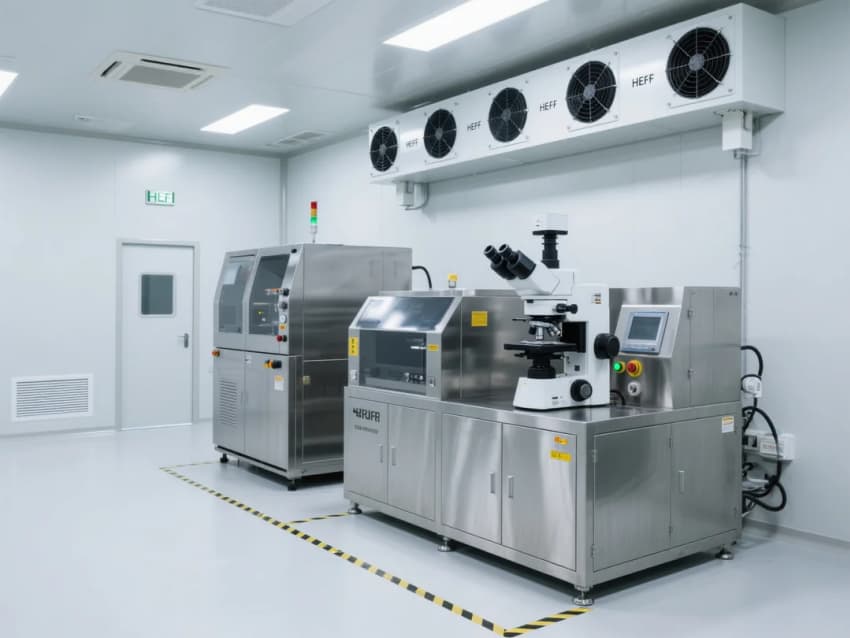天花采用模塊化FFU(風機過濾單元)系統,配合高效HEPA過濾器,維持穩定的氣流組織與潔凈度。設備區采用淺灰色不銹鋼圍擋,與白色潔凈墻面形成視覺區分,同時便于日常清潔維護。嵌入式LED無影燈帶提供均勻照明,減少作業陰影。整體設計強調功能性、安全性與可持續性,滿足電子光學制造的高標準環境需求。