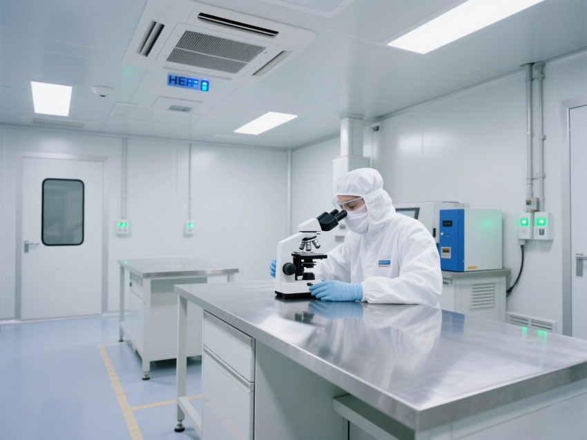 核心區(qū)域可見(jiàn)全封閉式潔凈廠(chǎng)房,墻面與地面采用無(wú)縫一體化設(shè)計(jì),避免積塵殘留。多組高效空氣過(guò)濾器整齊排列于頂部,通過(guò)層流送風(fēng)系統(tǒng)維持Class8級(jí)潔凈標(biāo)準(zhǔn)。?