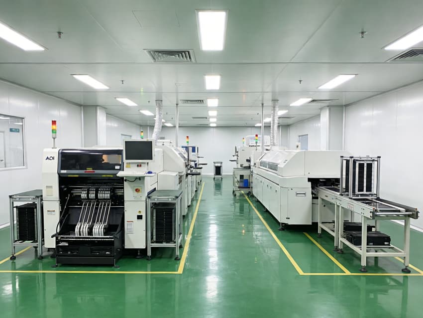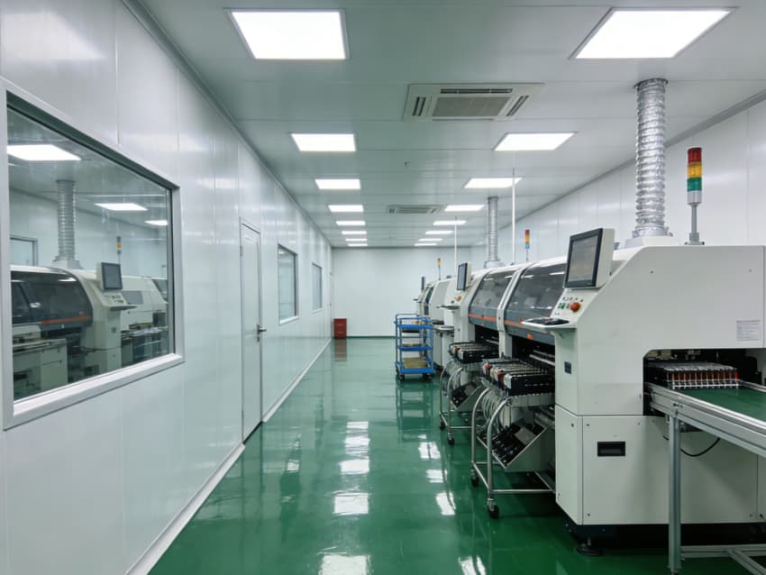 SMT 核心生產(chǎn)區(qū):針對高速貼片機(jī)、回流焊等設(shè)備做了地面承重加固與管線預(yù)埋,配置伸縮式通風(fēng)除塵管道,及時收集焊煙與粉塵;防靜電工作臺搭配 LED 工位燈,保障貼片、焊接的精度與效率。