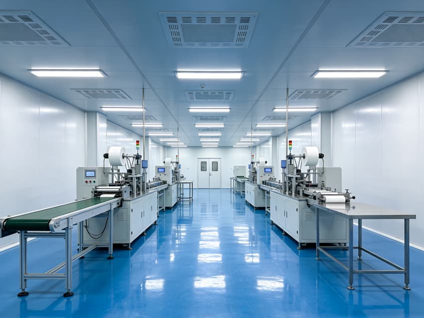 醫療器械生產車間內部采用灰色地面與白色墻壁的簡約統一風格,嚴格契合GMP潔凈生產規范,全方位保障醫療器械生產的無菌安全與合規性。灰色地面選用醫用級抗菌環氧自
